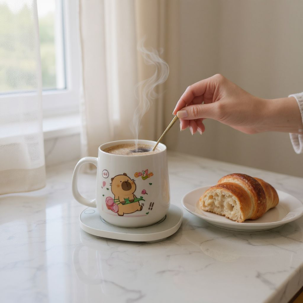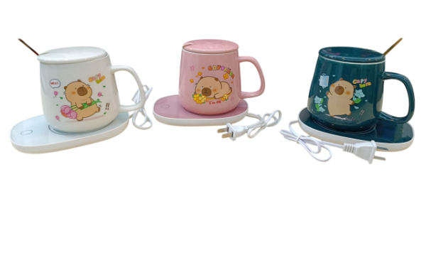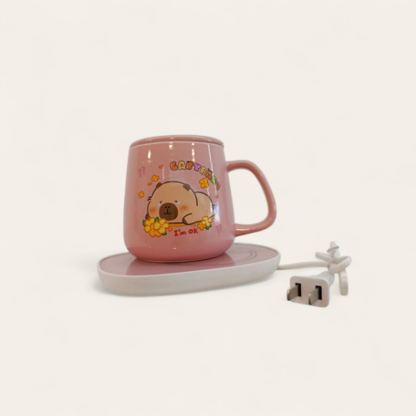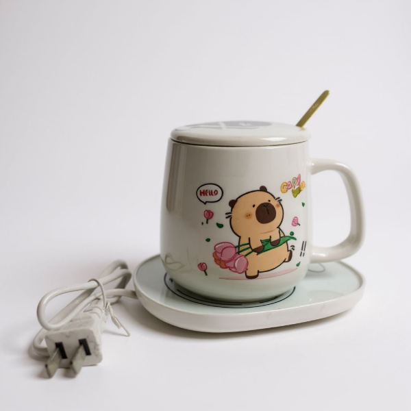 Taza Capibara con sistema térmico, Inclute tapa, cuchara, base térmica con enchufe.