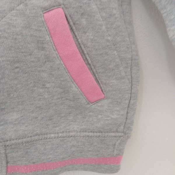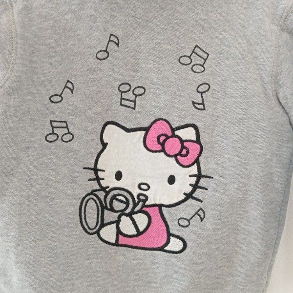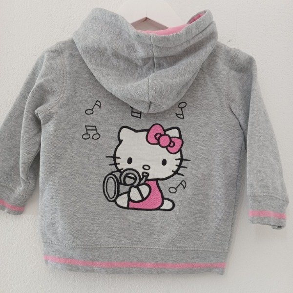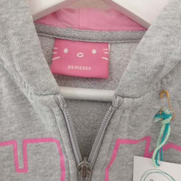 Buzo media estación, imagen bordada Kitty en anverso y reverso, cierre, capucha y bolsillos, tonos gris y rosa