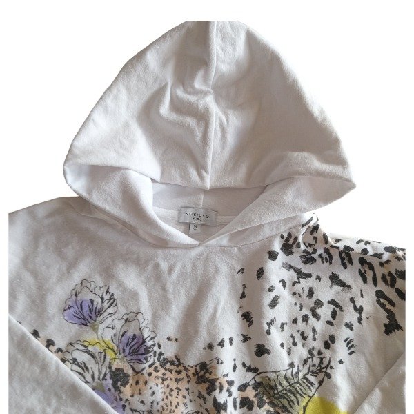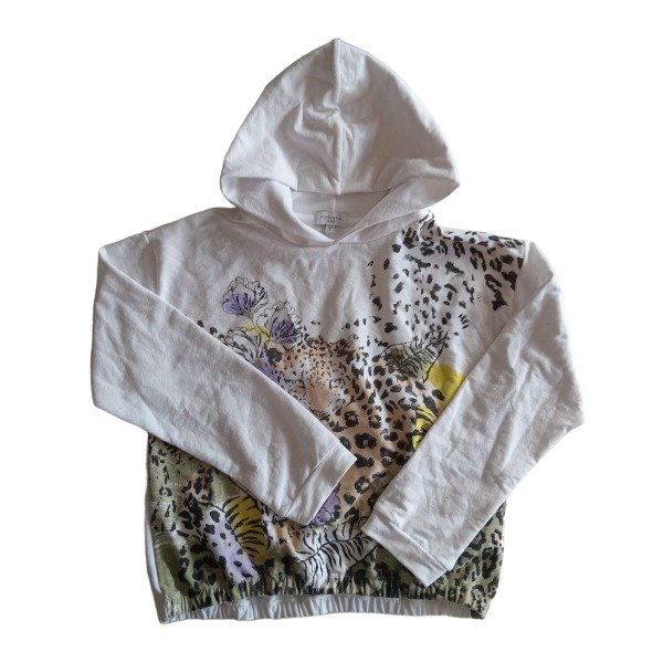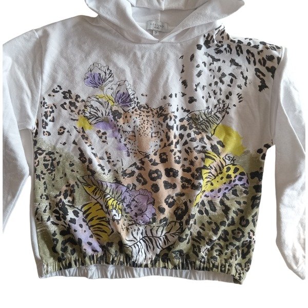 Buzo de algodón estampado con capucha y elastico en la cintura. (remera en combinación con misma estampa disponible en tienda también)