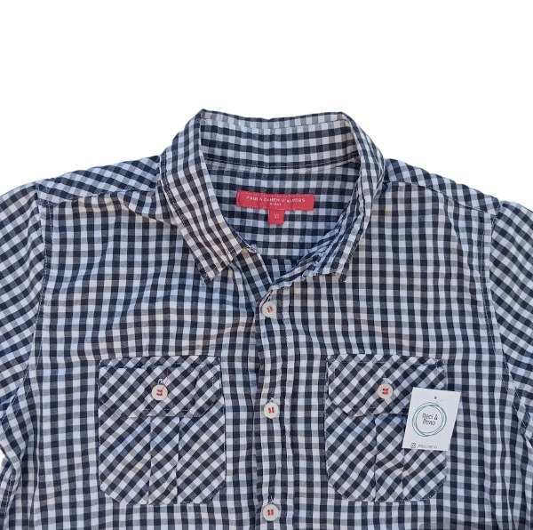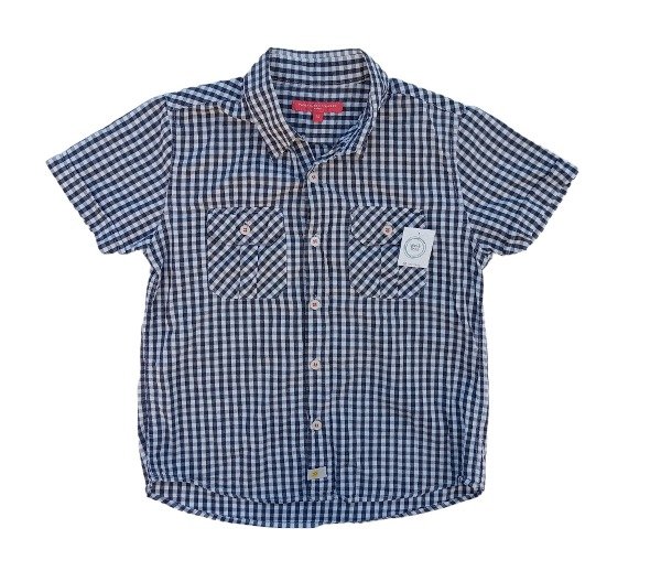 Camisa manga corta escocesa con blanco y negro, Bolsillos en parte delantera y botonadura frontal. Cuello clasico