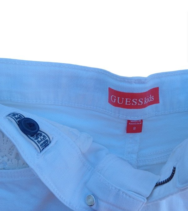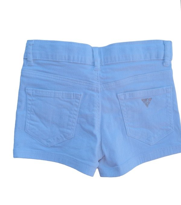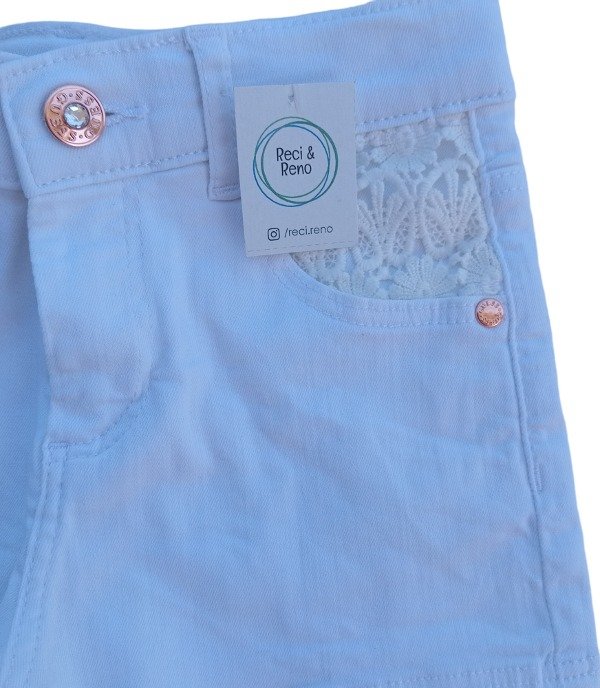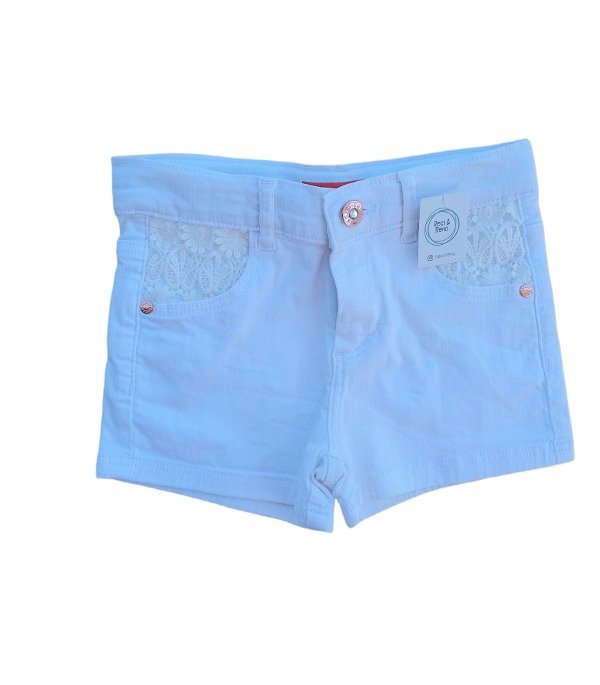 Short de jean blanco con botón y cierre. Bolsillos traseros y bolsillos delanteros con encaje.