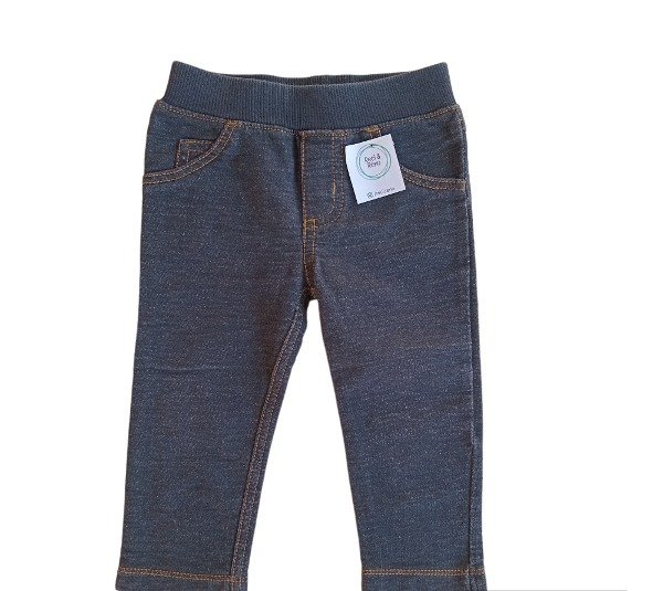 Calza de jean con spandex y cintura con pretina gruesa y ajustable. Dos bolsillos traseros