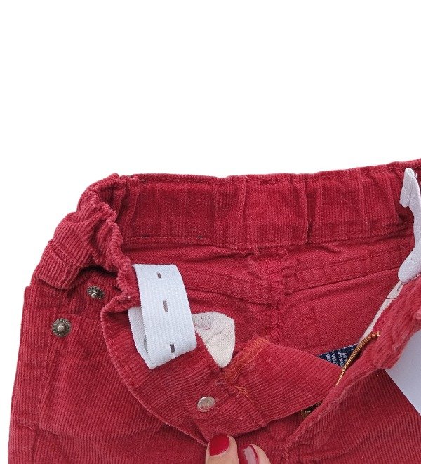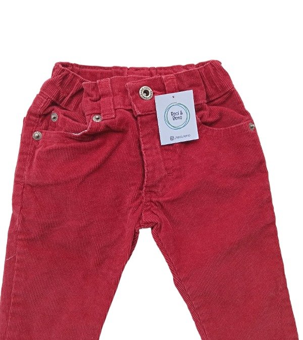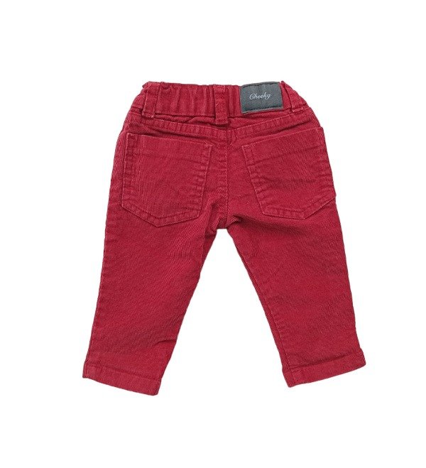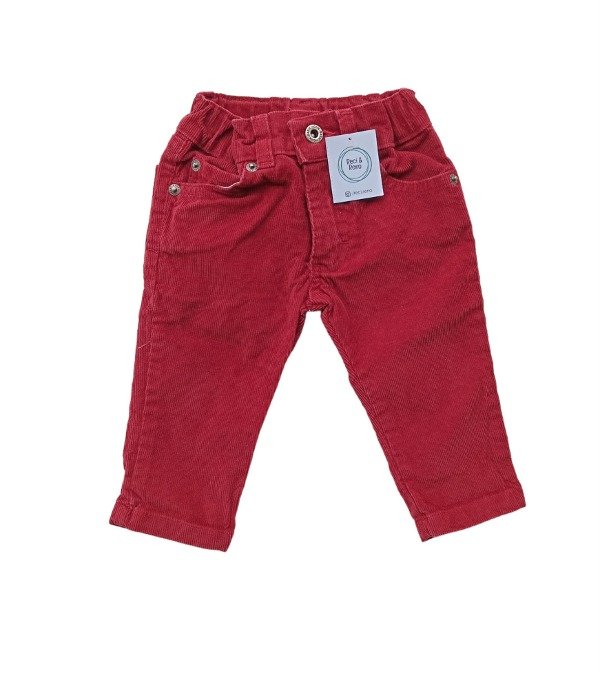 Pantalón de corderoy con bolsillos, cierre y botón. Tono bordó, Cintura regulable.