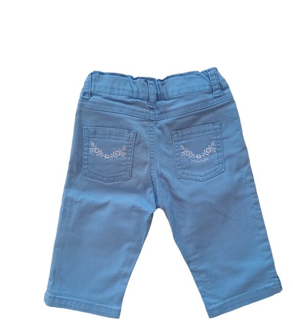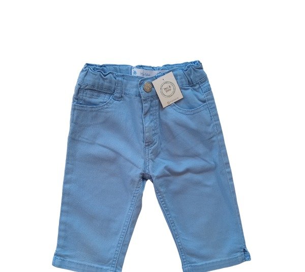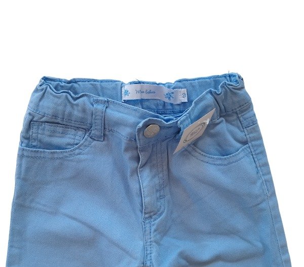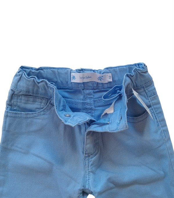 Pantalon denim con bolsillos delanteros y traseros. Cintura con elástico interior regulable, botón y cierre.
