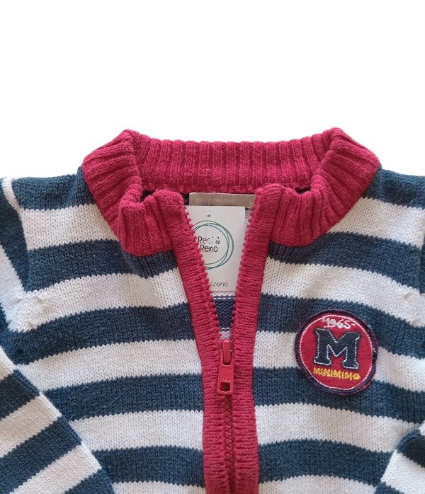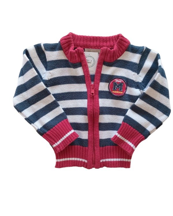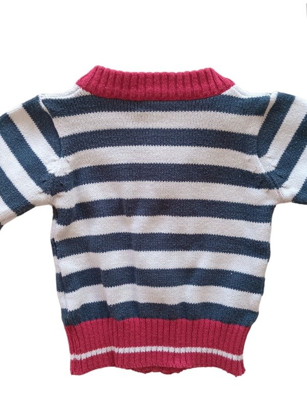 Saco de hilo grueso varón, con cierre, combinado azul, rojo y blanco. Cuello alto.