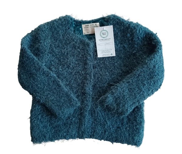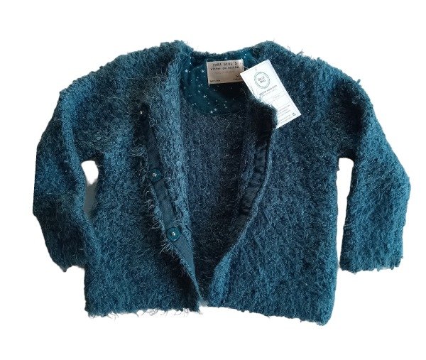 Saco de lana grueso con botones snaps, en tono azul petróleo, escote a la base.