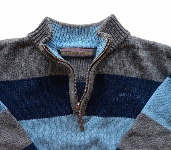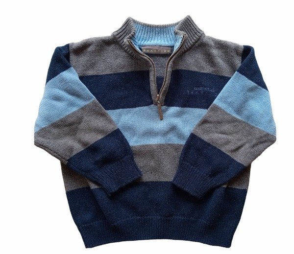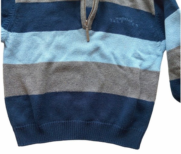 Sweater cuello alto con medio cierre. Pretina en mangas y cintura. Combinado azul, celeste y gris