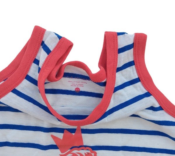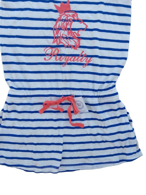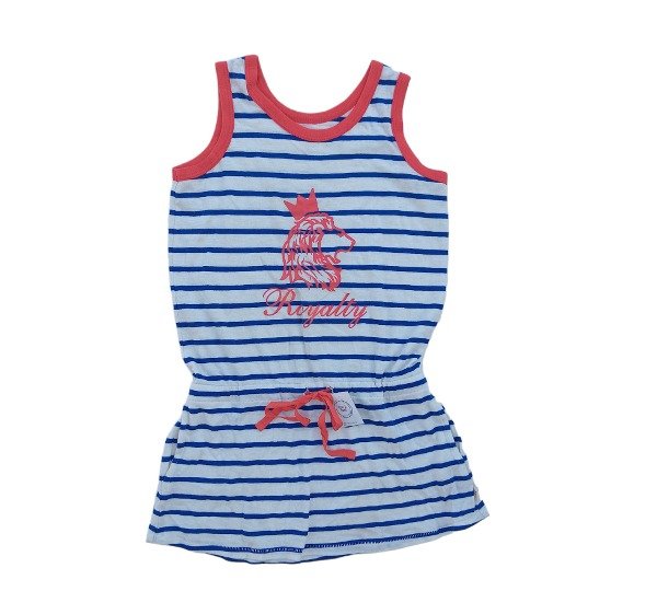 Solera de algodón con lazo ajustable en la cadera. Cuello a la base. Combinación en azul y rojo. Bolsillos laterales.