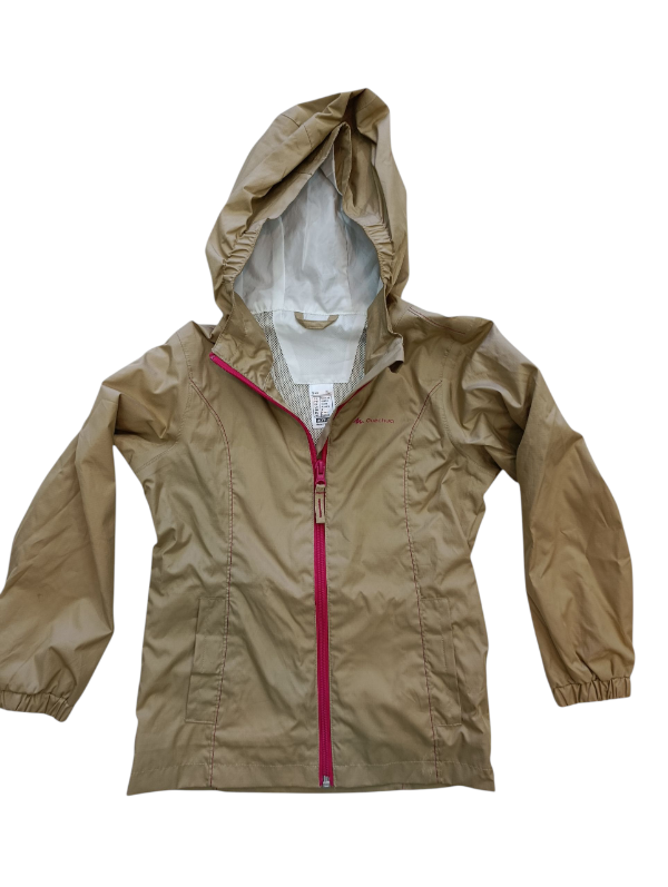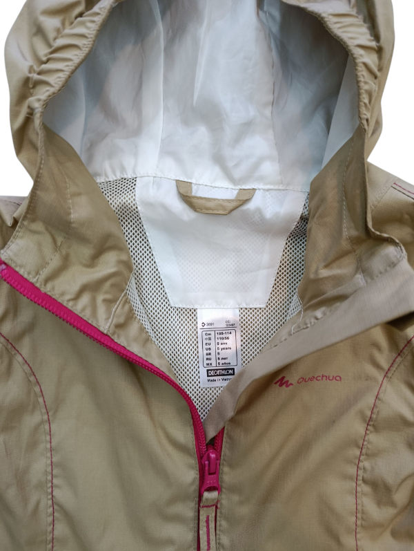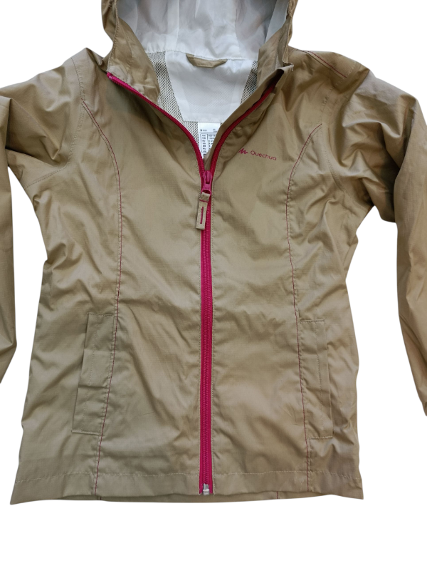 Campera tipo rompevientos con cierre, capucha y bolsillos combinada con fucsia.