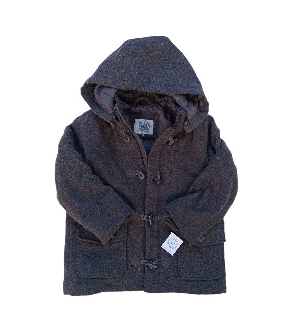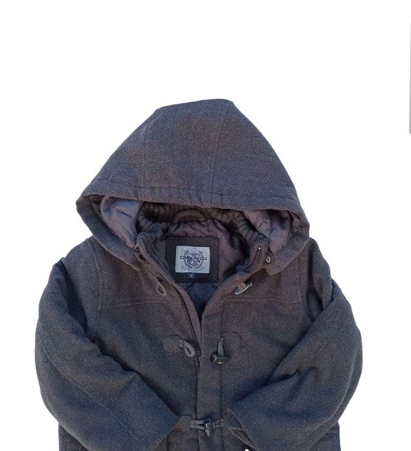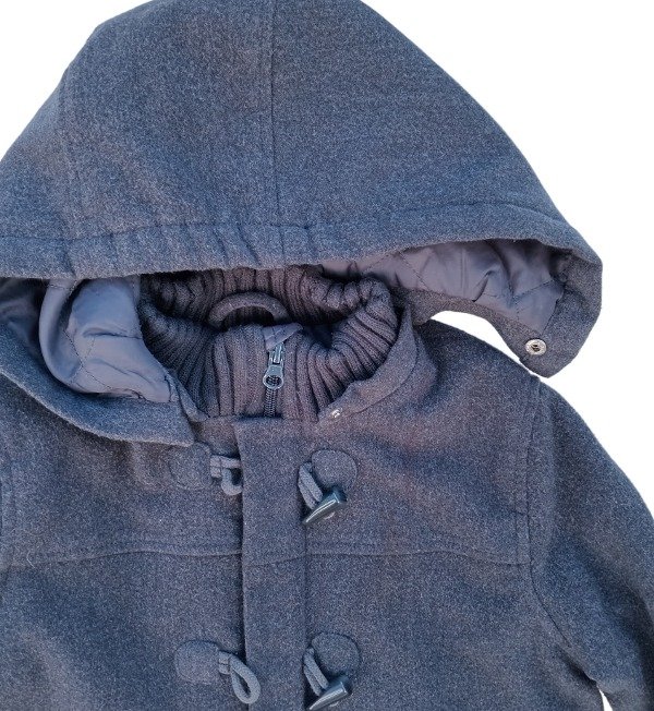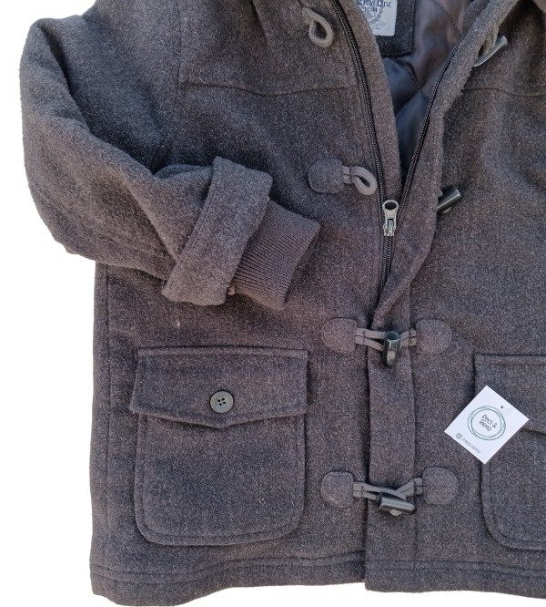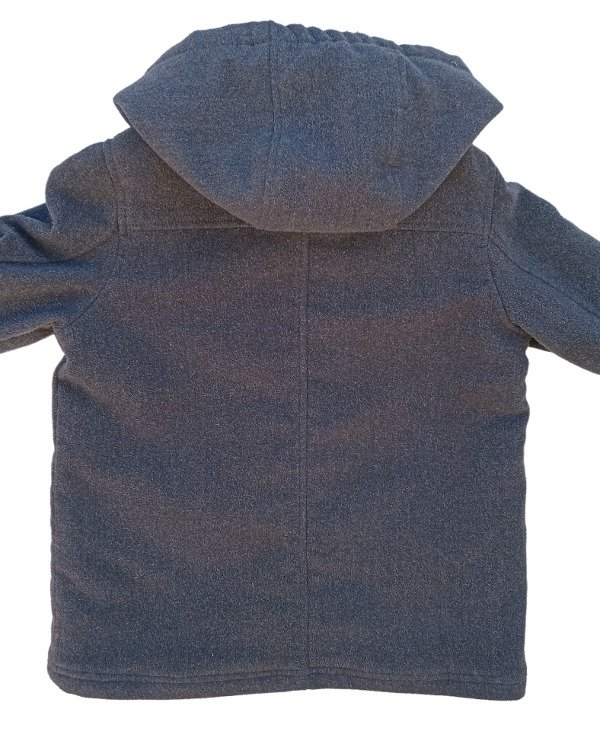 Abrigo de paño para varón en tono gris plomo. Abrigo en parte interior, bolsillos delanteros con tapa y capucha desmontable. Cuello alto con abrigo . Cierre y traba en parte delantera estilo montgomery. Puños con pretina interior para mejor temperatura.