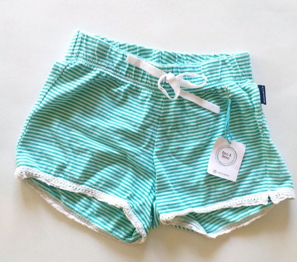 Short de algodón rayado blanco y verde, cintura con elástico y cordón puntilla en ruedo